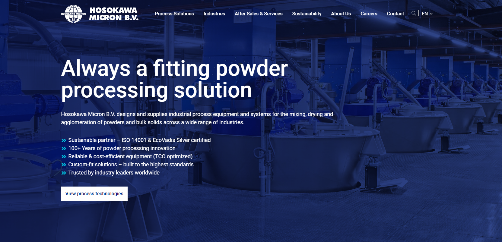 Hosokawa Micron B.V. is a Netherlands-based specialist in powder and bulk solids processing. They design and supply equipment for mechanical and thermal treatment—particularly mixing, drying, and agglomeration—for industries like food, pharma, chemicals, minerals, cosmetics, energy/environment, and animal feed. They operate R&D & test centers, have ISO 14001 environmental certification, and emphasize sustainable, custom-fit solutions.