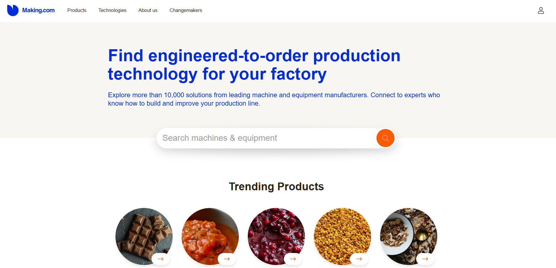 Making.com is a global platform that connects manufacturers with over 500 leading machine suppliers and 20,000+ technical experts. It offers more than 10,000 equipment solutions across industries such as food, pharmaceuticals, feed, chemicals, and minerals. The platform helps users quickly identify and source the right technologies while keeping all project data confidential.
